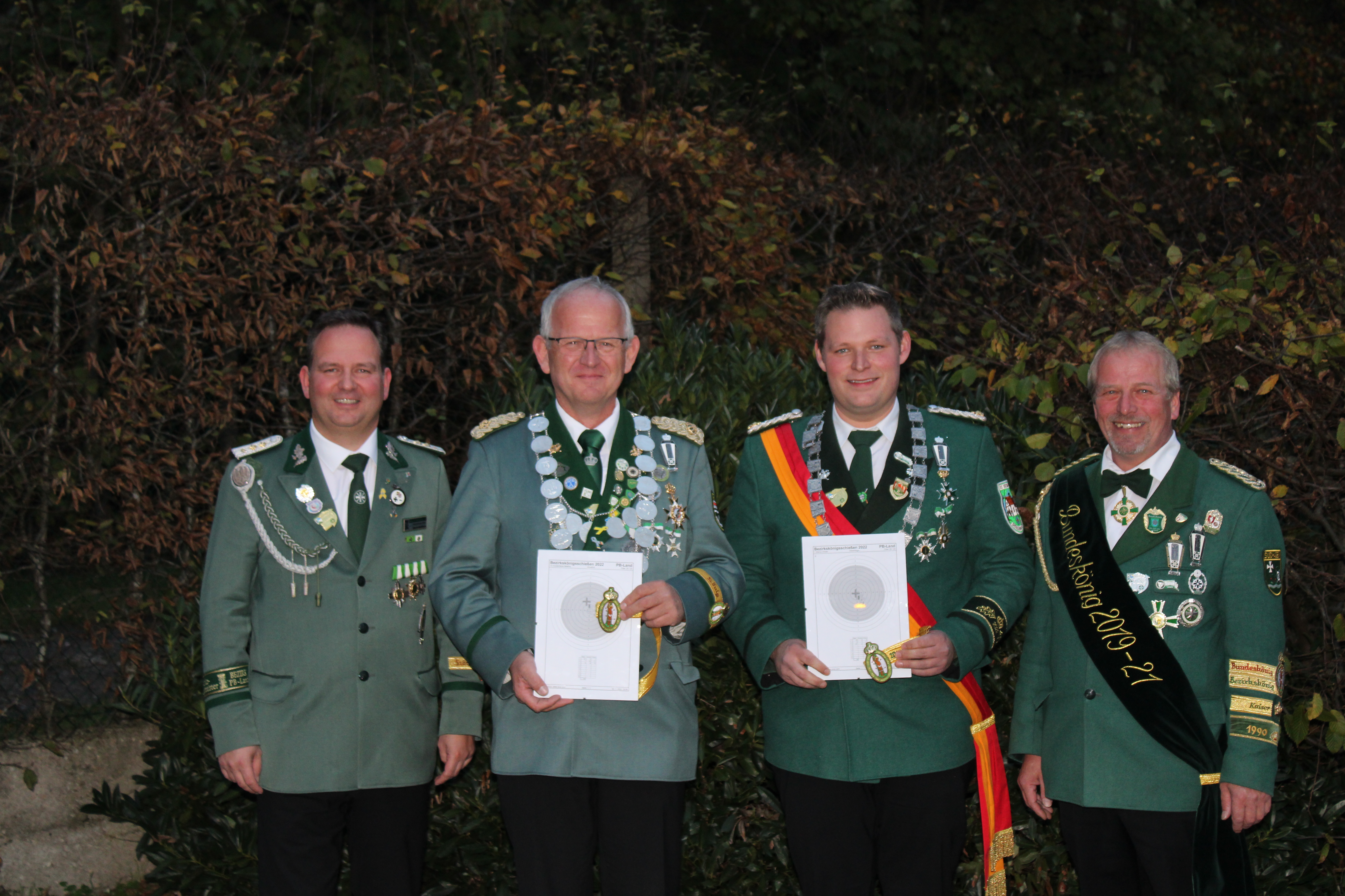 Die Geehrten des Bezirksverbandstages: (v.li.) die Bezirkskönige Matthias Vonderheide und Christopher Werny, Bezirksbundesmeister David Steffens, Ehrenoberst Hubert Bonke